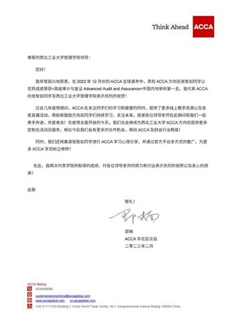 近日,ACCA(英国特许公认会计师公会)公布2022年12月考季成绩,我校管理学院会计学(ACCA方向)专业2019级张智如同学以优异成绩荣获< 高级审计与鉴证 Advanced Audit and Assurance>中国内地单科第一名。ACCA华北区总监代表ACCA中国总部发来贺信,对张智如同学以及我校管理学院表示热烈的祝贺。