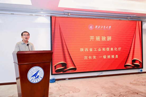 陕西省工业和信息化厅沈长友一级巡视员作培训动员讲话,他首先对承办此次培训的西北工业大学表示感谢,随后就当前陕西省民营经济发展现状以及省委省政府出台的支持民营经济发展的一系列政策文件进行了介绍,他指出民营经济已成为我省经济的重要支柱、税收的重要来源、就业的重要方向,民营企业为陕西省的经济发展做出了重大贡献。最后,又深刻阐述了举办这次培训班的重要意义,并对本次培训班的教学计划及课程安排进行了说明。他希望此次参训的民营企业负责人能够齐心协力,为陕西民营企业的高质量发展做出更大贡献。