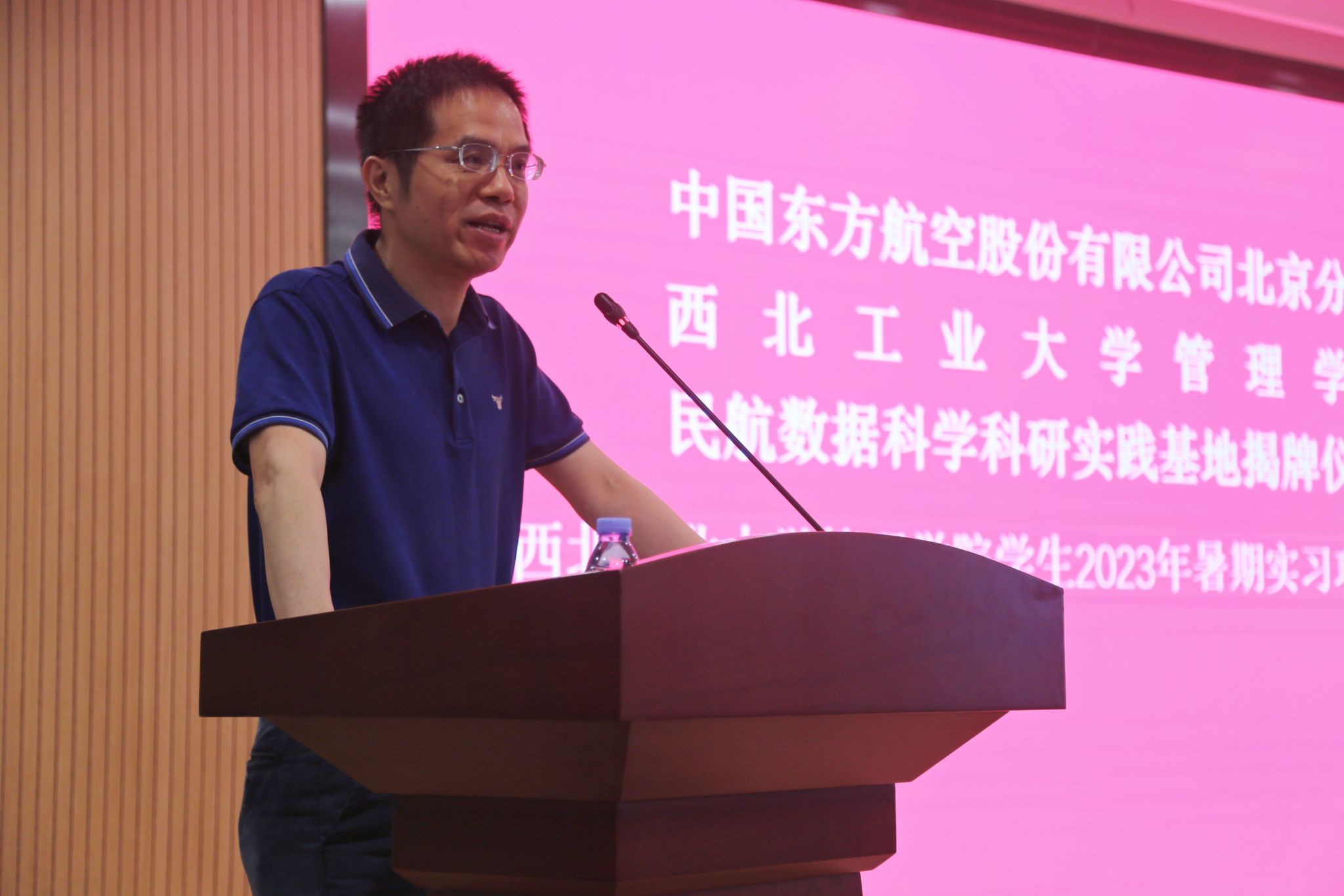 车阿大首先介绍西北工业大学是一所以发展航空、航天、航海等领域人才培养和科学研究为特色的多科性、研究型、开放式大学,是国家“双一流”建设高校。管理学院建院30年来在国防科技企业管理创新、项目管理、工业工程与管理等多个方向具有鲜明的研究特色。并表示,“民航数据科学科研实践基地”的成立,是管理学院与东航进一步加强合作的一次重要的里程碑。该实践基地将汇集高校和企业力量,致力于推动创新性的研究和实践,开展多领域的合作与交流,共同解决民航数据科学领域的重大问题和挑战。同时,该基地还将为学生和研究人员提供一个广阔的产学研合作平台,促进青年才俊的成长和壮大,为我国的民航领域、数据科学领域培养出更多的优秀人才;随后对东航北京分公司谢总、钟总、郭总及飞行部、服质部、地服部等多部门专家对本次基地共建和实习工作的支持表示感谢;最后,车阿大对实习同学寄予期望,希望大家珍惜机会,直面难题,虚心求教。