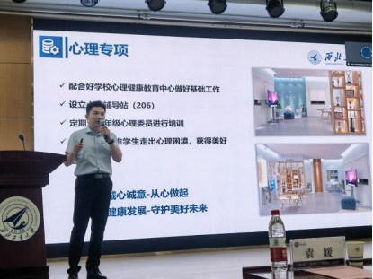 王兆旭向同学们介绍了管理学院学生工作情况,主要从工作思路、校规校纪、班风学风、创新创业、奖助学金、就业工作及心理工作七大方面展开讲解。管理学院遵循“育人和育才相统一,育人为本”的基本原则,为实现立德树人的根本任务已建立起“三全育人、五育并举”的教育体系。基于学院浓郁的创新创业氛围、多元的资助奖励体系、良好的学习生活环境,他鼓励同学们要大胆开展创新、创业项目,努力提升科研学术能力,积极参与国际项目交流,以实现全面发展。