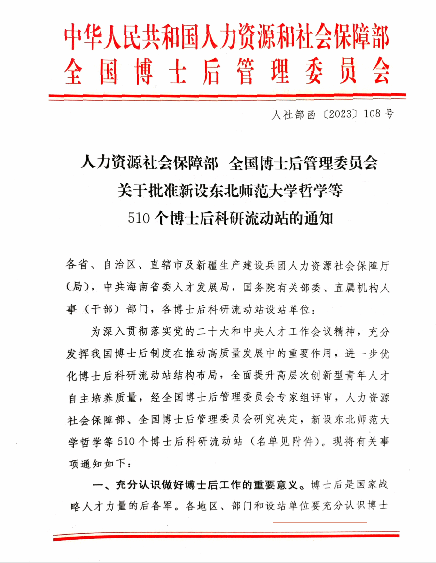 近日,人力资源和社会保障部、全国博士后管理委员会联合下发《关于批准设立东北师范大学哲学等510个博士后科研流动站的通知》(人社部函〔2023〕108号),管理学院工商管理学博士后科研流动站批获设立!