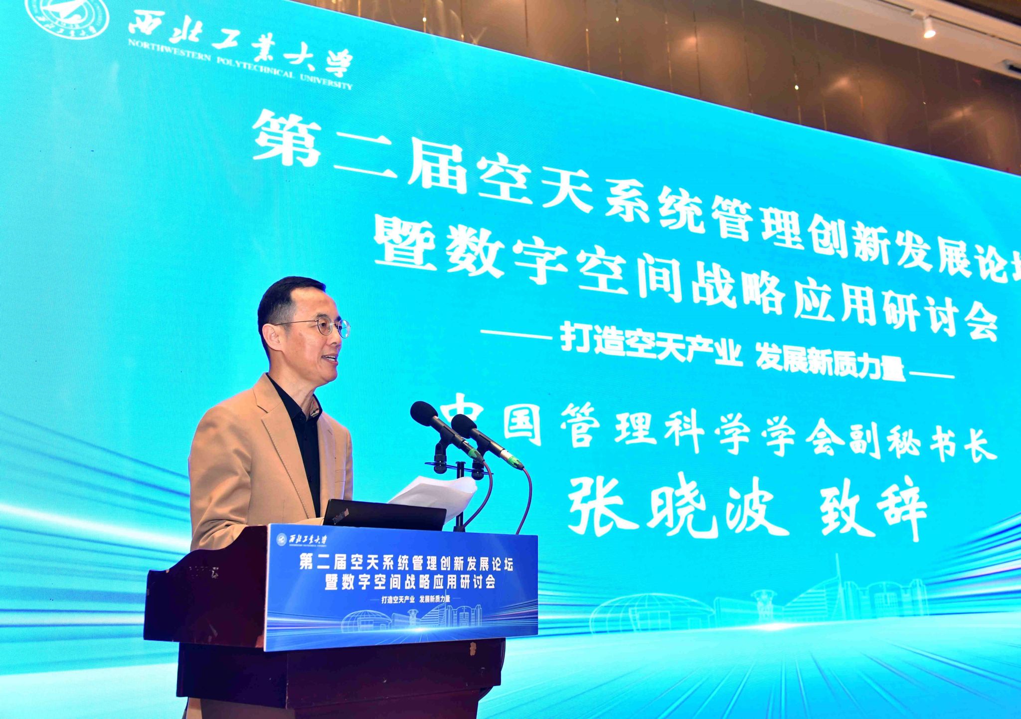 中国管理科学学会副秘书长张晓波对出席嘉宾表示热烈欢迎,也感谢西北工业大学组织的这次论坛,并通过四个思考传达了这次论坛的初衷和意义。他表示,空天产业发展是国家科技实力的重要标志,是新质生产力转化为实际生产力的关键引擎,以数字化转型为载体的驱动,空天管理创新的突破发展是建设航空强国、航天强国的迫切需求,也是航天产业发展的必然方向,我们必须时刻以前瞻思维和改革精神攻坚克难。