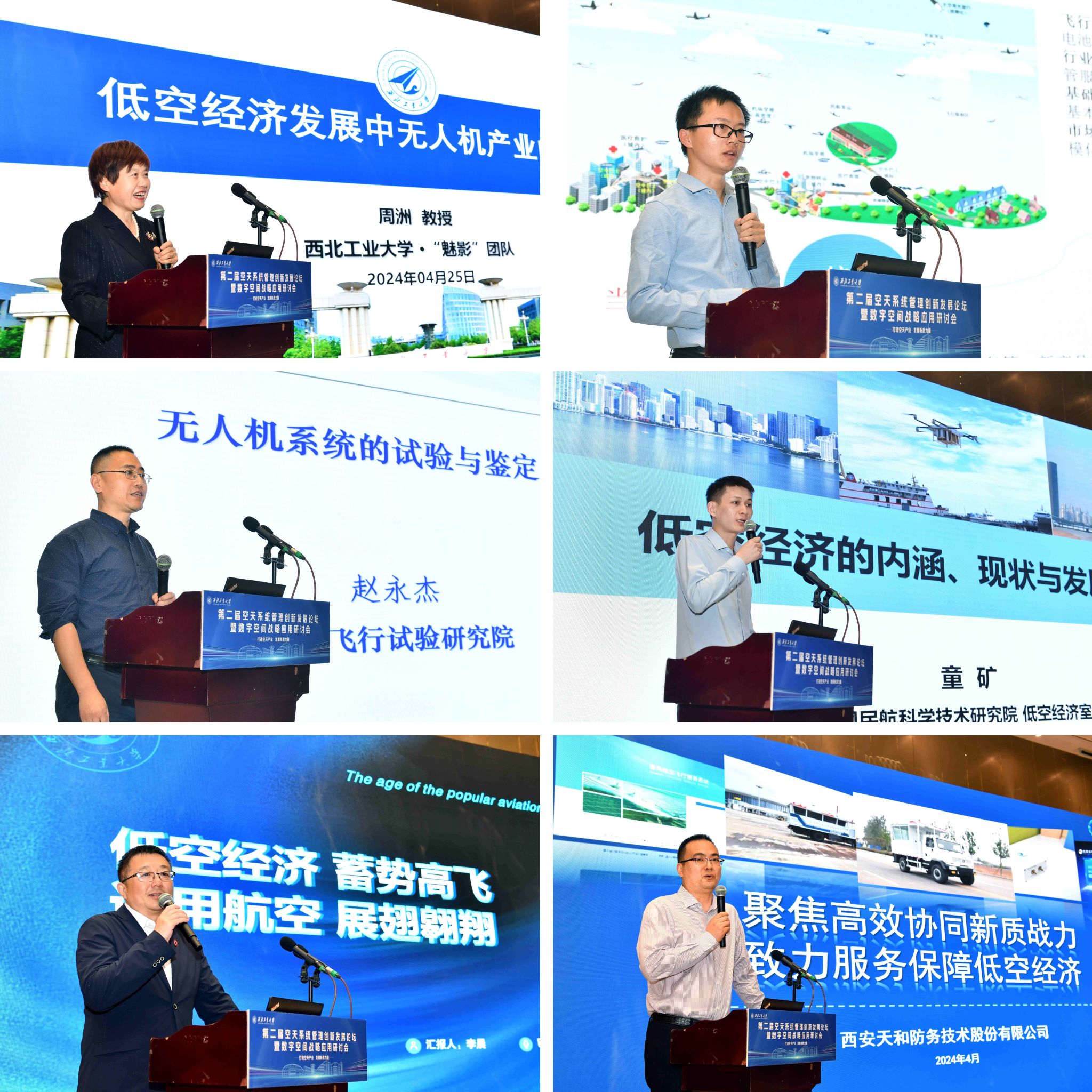 “低空经济高质量发展”论坛由中国民航大学许垒教授和无人机联盟秘书处王晨光主持。西北工业大学周洲教授带来题为《低空经济发展中无人机产业的思考》的报告;工业和信息化部装备工业发展中心低空经济研究员金伟作《低空产业发展思考》的报告;中国飞行试验研究院型号试飞总师赵永杰作《无人机系统的试验与鉴定》的报告;中国民航科学技术研究院航空运输研究所低空经济室副研究员童矿展开《低空经济的内涵、发展及趋势》的报告;西北工业大学民航研究院李晨副院长带来题为《低空经济蓄势高飞通用航空展翅翱翔》的报告;天和防务技术股份有限公司宋志鹏副总经理作《聚焦高效协同新质战力,致力服务保障低空经济》的报告。