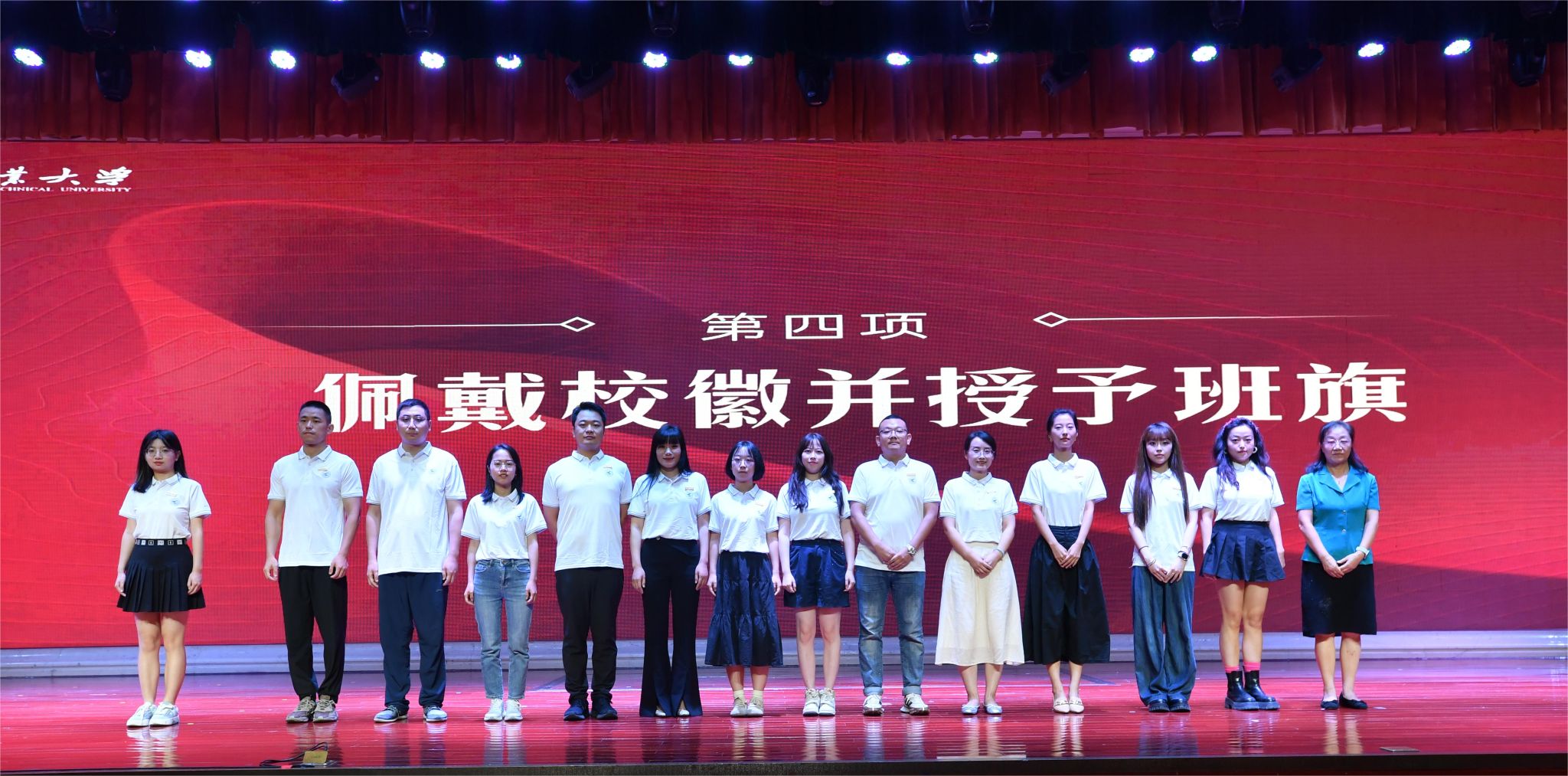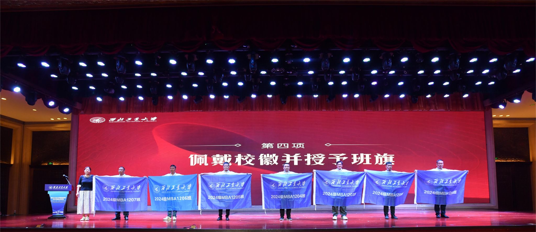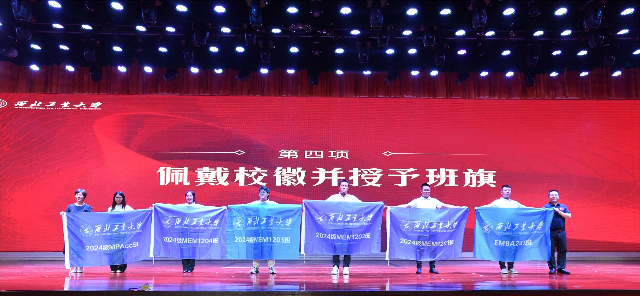 典礼上,学院党委书记张爽为新生代表佩戴西北工业大学校徽,MBA/MEM教育中心主任杨宏玲、MBA教育中心副主任肖平、MBA/MEM/MPAcc教育中心副主任黄媛为各位新生代表授予班旗。