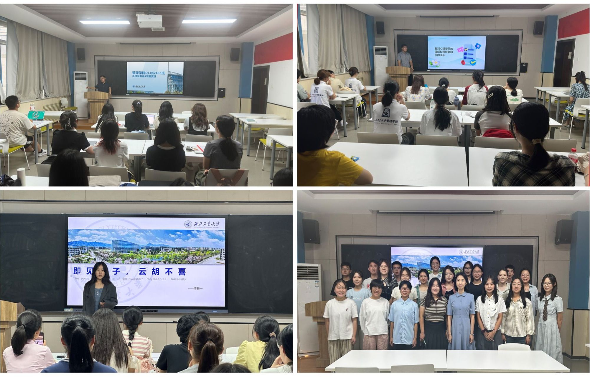 9月6日下午,学院召开了首次2024级新生大班会,辅导员张宇带领全体新生认真学习了《西北工业大学学生手册》,重点学习了学生违纪行为处理、公寓管理、请销假等管理规定。张宇还详细讲解了《管理学院本科生学风建设实施方案》,并围绕学风建设相关工作做了安排。学工秘书巩雪向同学们细致讲解了管理学院本科生综合素质测评的具体实施细则,全面介绍了学院的奖助政策体系、本科生参与创新创业工作的相关政策和机会。学工秘书张梦予全面介绍了学生党建工作的重要性和党员发展流程,详细讲解了大一新生如何努力争取早日加入党组织,让新生对党组织有了更清晰的认识和了解。此外,2024级各小班还在班主任的主持下召开了班会,组织开展了破冰活动,选举产生了各班班委,为班级后续各项工作的顺利开展打下了良好基础。