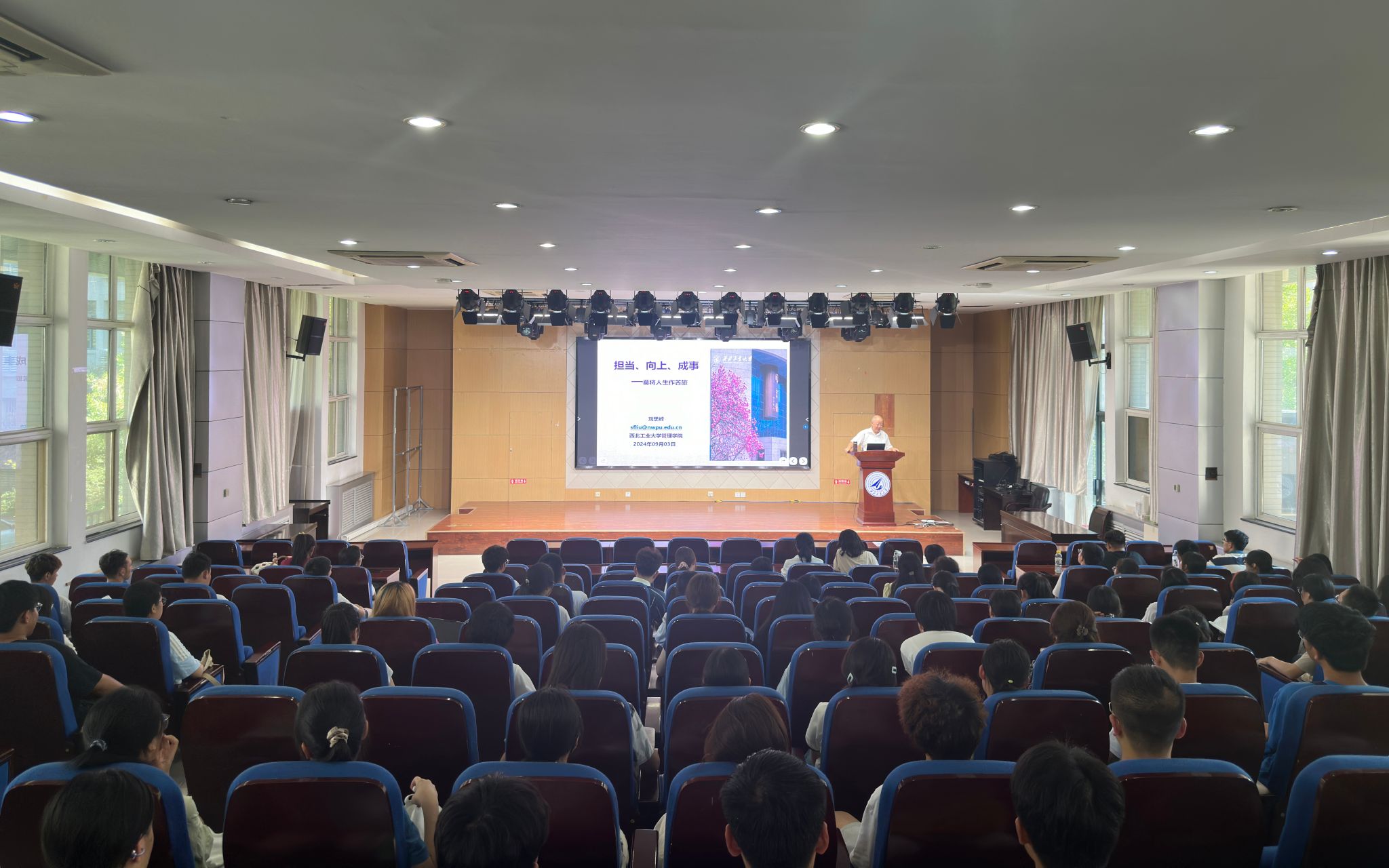9月3日下午,全国优秀教师、管理学院刘思峰教授以“担当、向上、成事”为题为新生们作报告。他以解读苏轼的词《临江仙·送钱穆父》开场,向同学们阐述了三种至关重要的处世心态:第一,无论何时何地,都应秉持积极乐观的心态;第二,要学会运用灰度思维来审视问题,并在实践中寻求价值的平衡;第三,他强调了“无私者成其私”的道理,即真正的无私往往能成就个人的长远利益。他鼓励同学们注重自我修养与提升,不断修炼来拓宽个人的视野与格局。