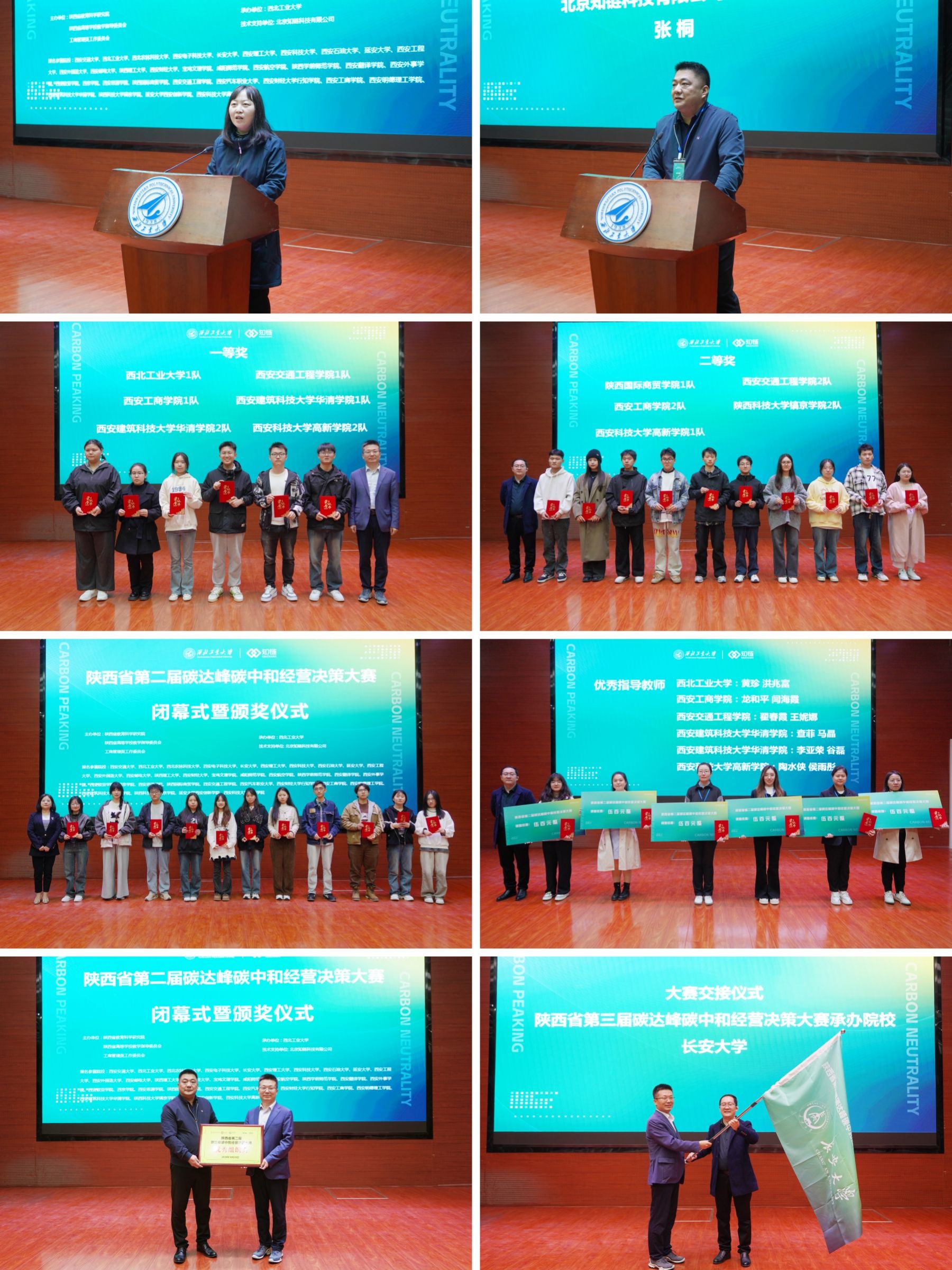 大赛闭幕式暨颁奖仪式于下午17:00举行。西北工业大学管理学院副院长陈琳教授主持,并代表管理学院感谢各位专家领导和参赛选手们对本次论坛的大力支持。北京知链科技有限公司助理总裁张桐进行了大赛工作总结。随后,进行了大赛的颁奖仪式,颁发了大赛一、二、三等奖,优秀指导教师奖和优秀组织奖。西北工业大学管理学院副院长贾明教授为大赛闭幕式致辞,并进行了大赛交接仪式。至此,陕西省第二届碳达峰碳中和经营决策大赛圆满落下帷幕。