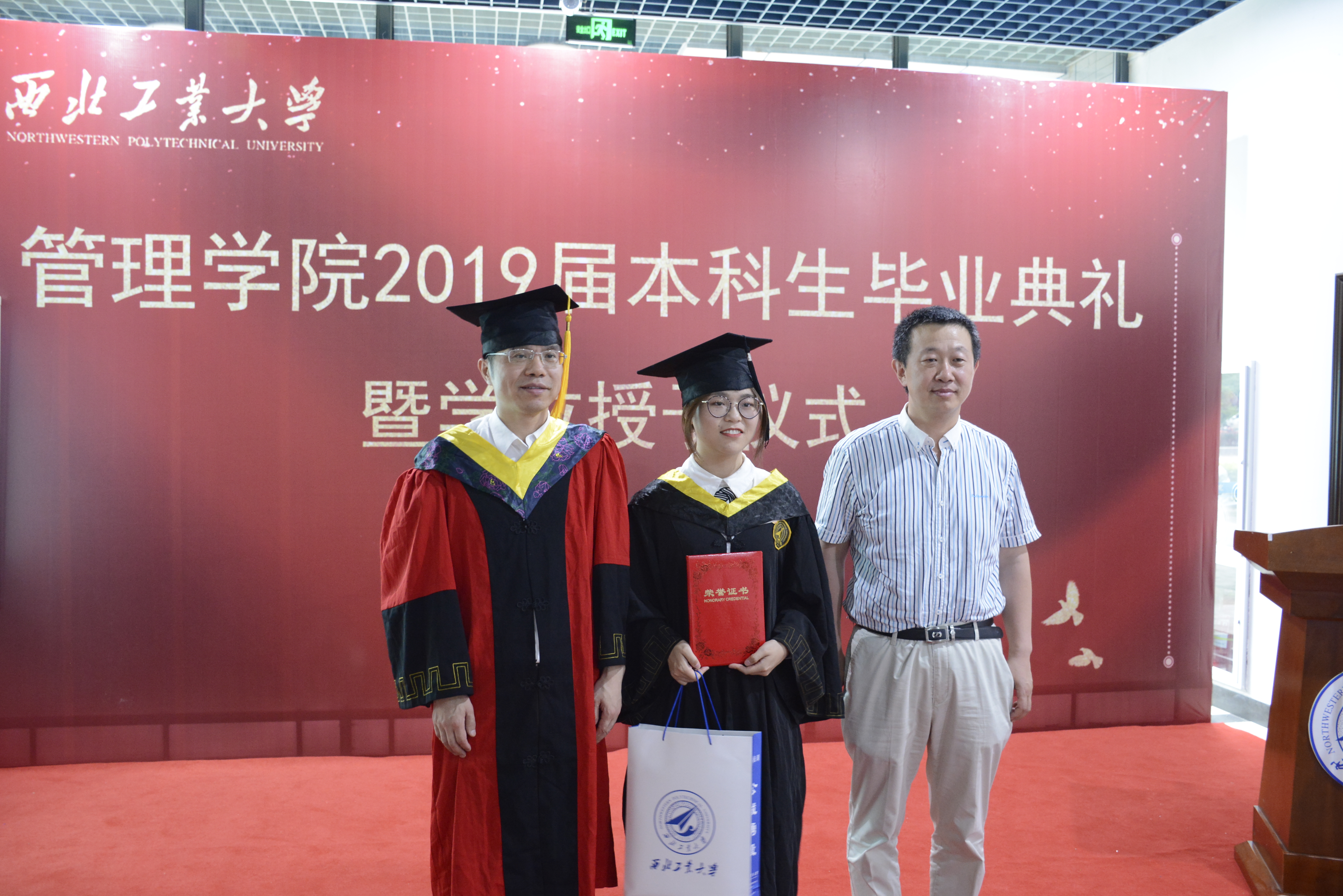 在激昂的乐曲声中,管理学院院长车阿大,党委书记李小聪为优秀毕业生,校友联络人以及获得2019届西工工业大学“翱翔学子建功立业奖”毕业生拨穗,颁发荣誉证书并赠送毕业礼物。获奖学生们纷纷表达了对母校、学院,师长的感恩之情,并表示今后将不断努力拼搏,有所作为,为管院,为母校争光添彩。
