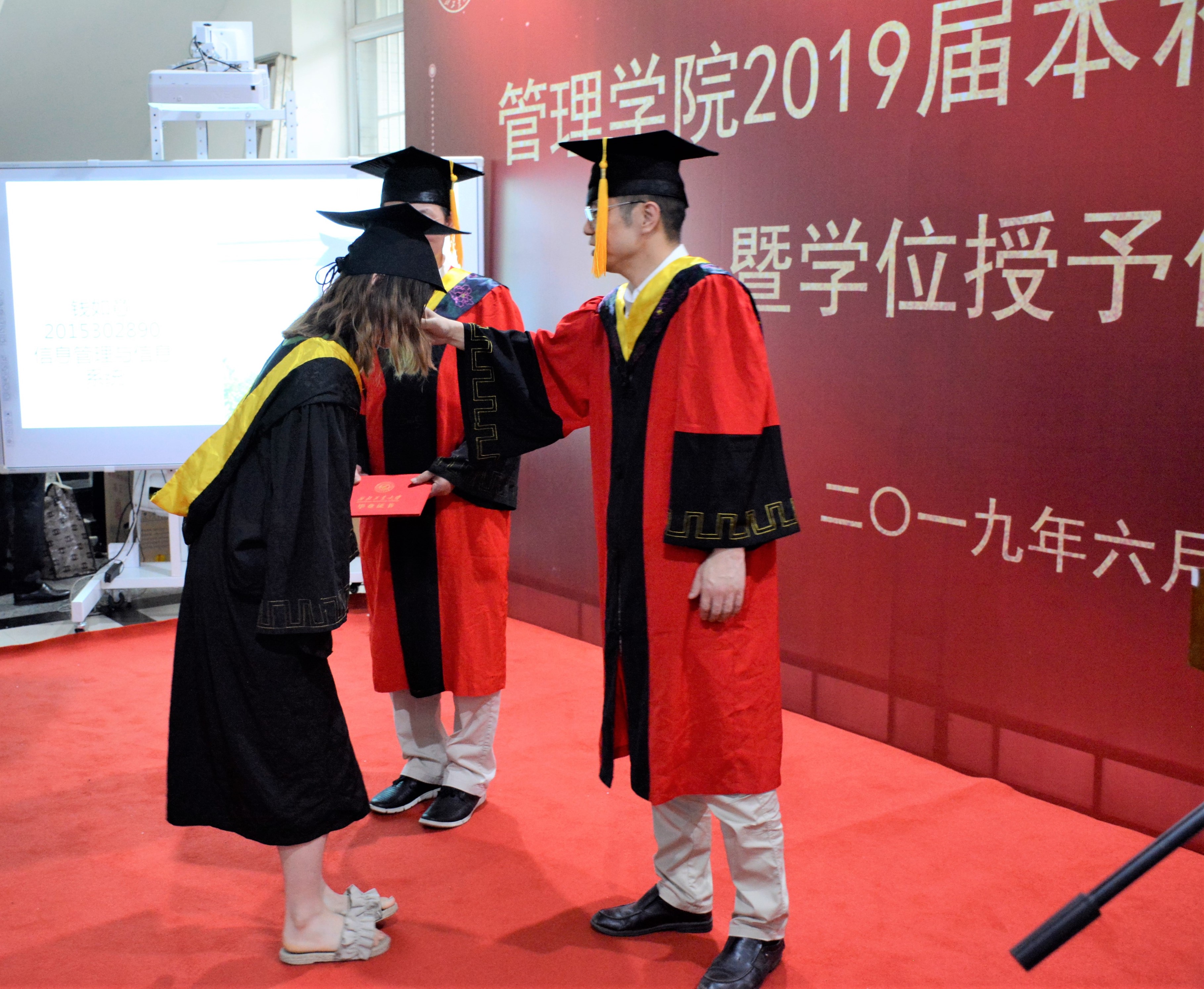 最后,管理学院党委副书记曹子尧宣读获得管理学学士学位的毕业生名单,车阿大院长为毕业生们正冠拨穗、李小聪书记颁发毕业证书并赠送毕业礼物。在依依不舍的告别声中和师长的殷切希望中,管理学院2019届本科生毕业典礼暨学位授予仪式圆满结束。