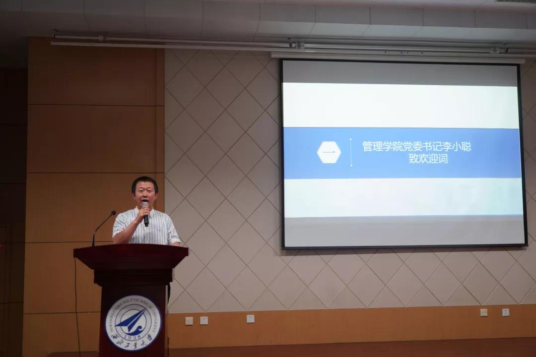 接下来举行了会议的第一项:李小聪书记上台致欢迎词。在发言中书记再次表达了对各位新生家长到来的感谢,接着强调了管理的价值在凸显,是当今世界的重要生产力。针对在座的新生,书记表达了对大家的期望与肯定,希望新生们在接下来的时间里能够为了自己的目标不断努力、学会“自我管理”,期盼2019级新生带着美好的愿景,将心中的火转化为智慧和才干。