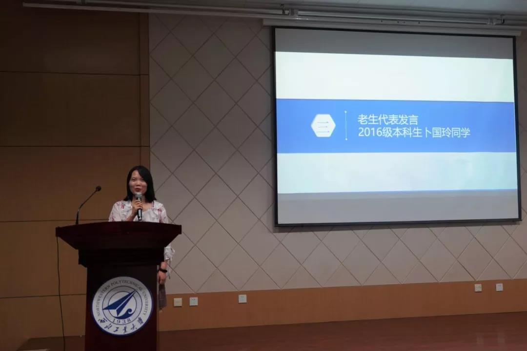 学院学生代表卜国玲同学、新生代表刘畅同学相继上台分享了自己的感想与见解。卜国玲同学根据自己的学习生活、工作实践,为大家分享了自己在工大的点滴进步与收获体会。刘畅同学表达了自己入学时的激动心情和与新同学们共同砥砺前行,实现自我价值的美好期盼。