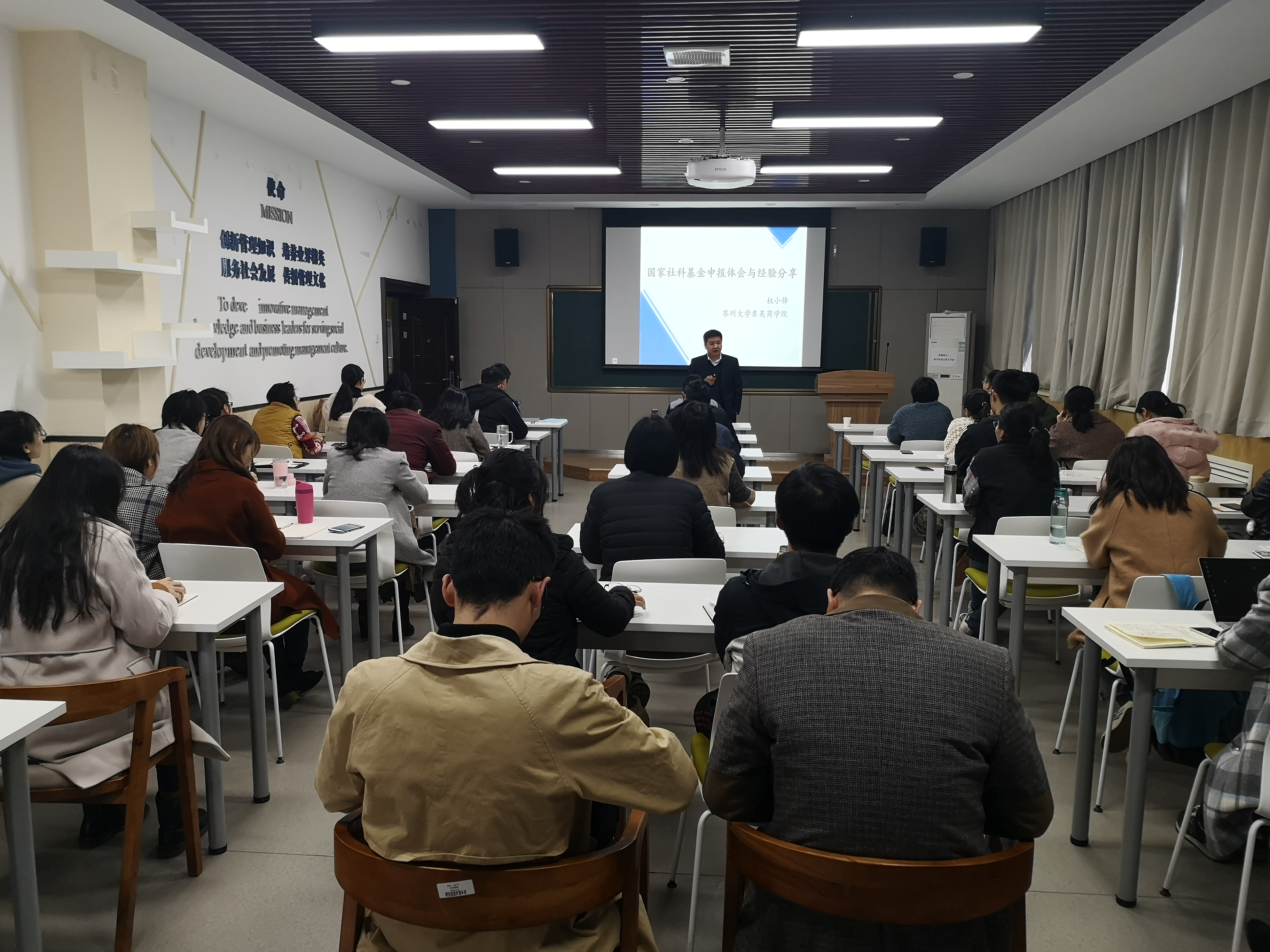 2019年11月19日上午,应管理学院邀请,苏州大学东吴商学院权小锋教授在长安校区管理学院214教室做了题为“国家社会科学基金申报体会与经验分享”的报告会。本场报告会由贾明教授主持,学院中青年教师以及博士生40余人参加。