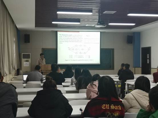 首先,吕志鹏教授详细介绍了柔性车间作业调度问题及其特点和性质。然后,吕教授介绍了如何用析取图模型来表示问题和问题的解,并阐述了如何定义和评估师徒进化算法中使用的邻域移动。最后,吕志鹏教授讲解了师徒进化算法的具体实现过程并展示了算法的求解结果。在提问环节,吕志鹏教授一一解答的在场师生的提问。