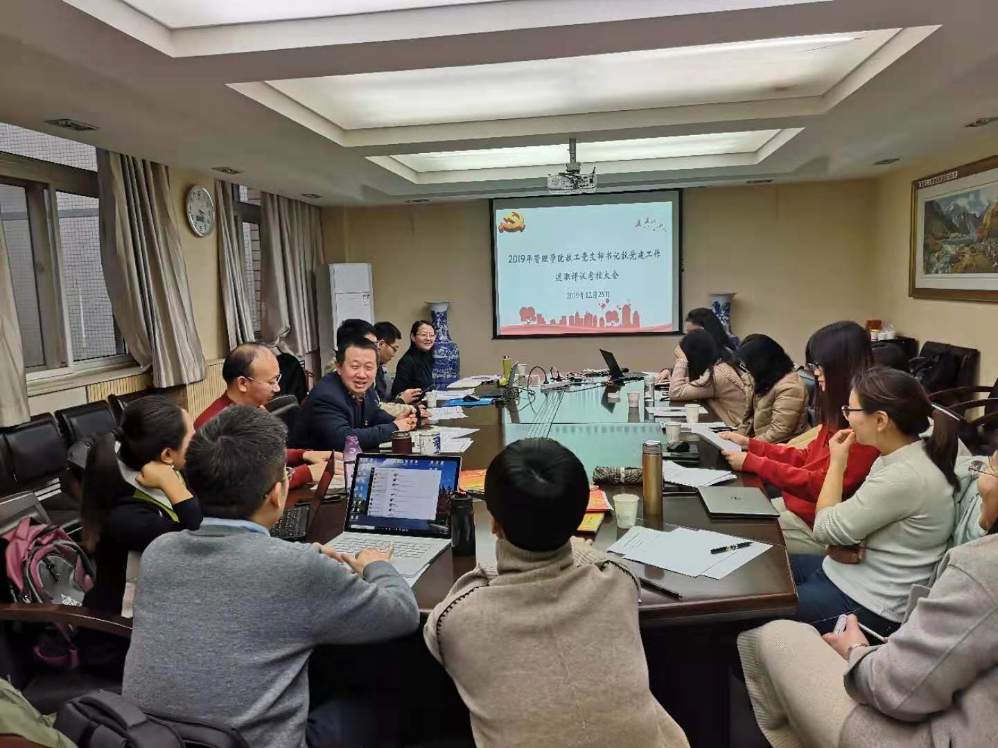 为深入学习贯彻习近平新时代中国特色社会主义思想和党的十九大精神,全面落实管党治党政治责任,进一步推动全面从严治党向基层延伸,12月25日下午,在友谊校区管理学院楼308会议室,管理学院党委召开了2019年度教职工党支部书记抓党建工作述职评议大会。学院班子成员、工会副主席、系主任及系主任助理代表、教师代表共计11人担任评委。会议由学院党委书记李小聪主持。