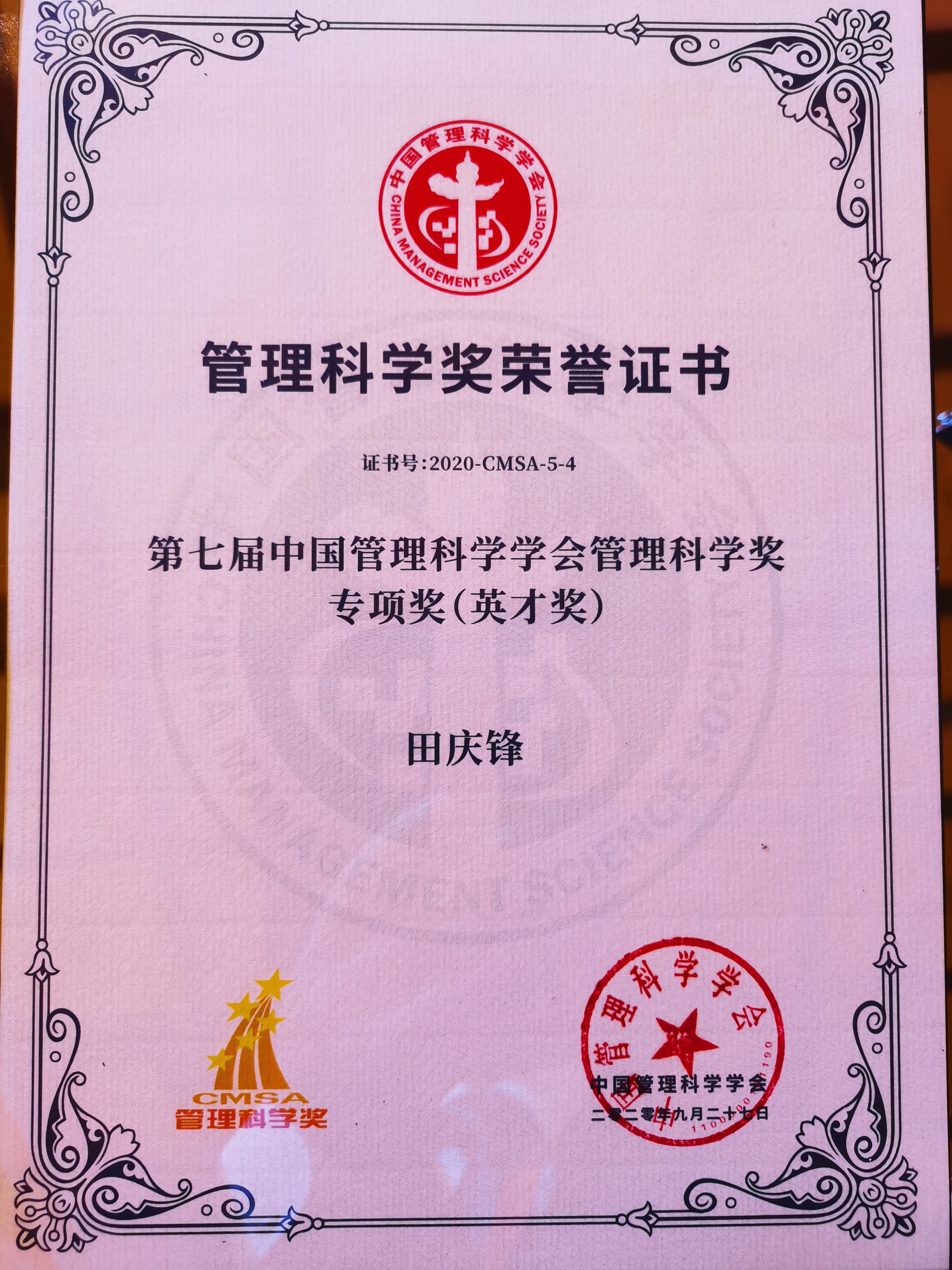 我院田庆锋教授获得中国管理科学学会第七届管理科学奖专项奖-英才奖