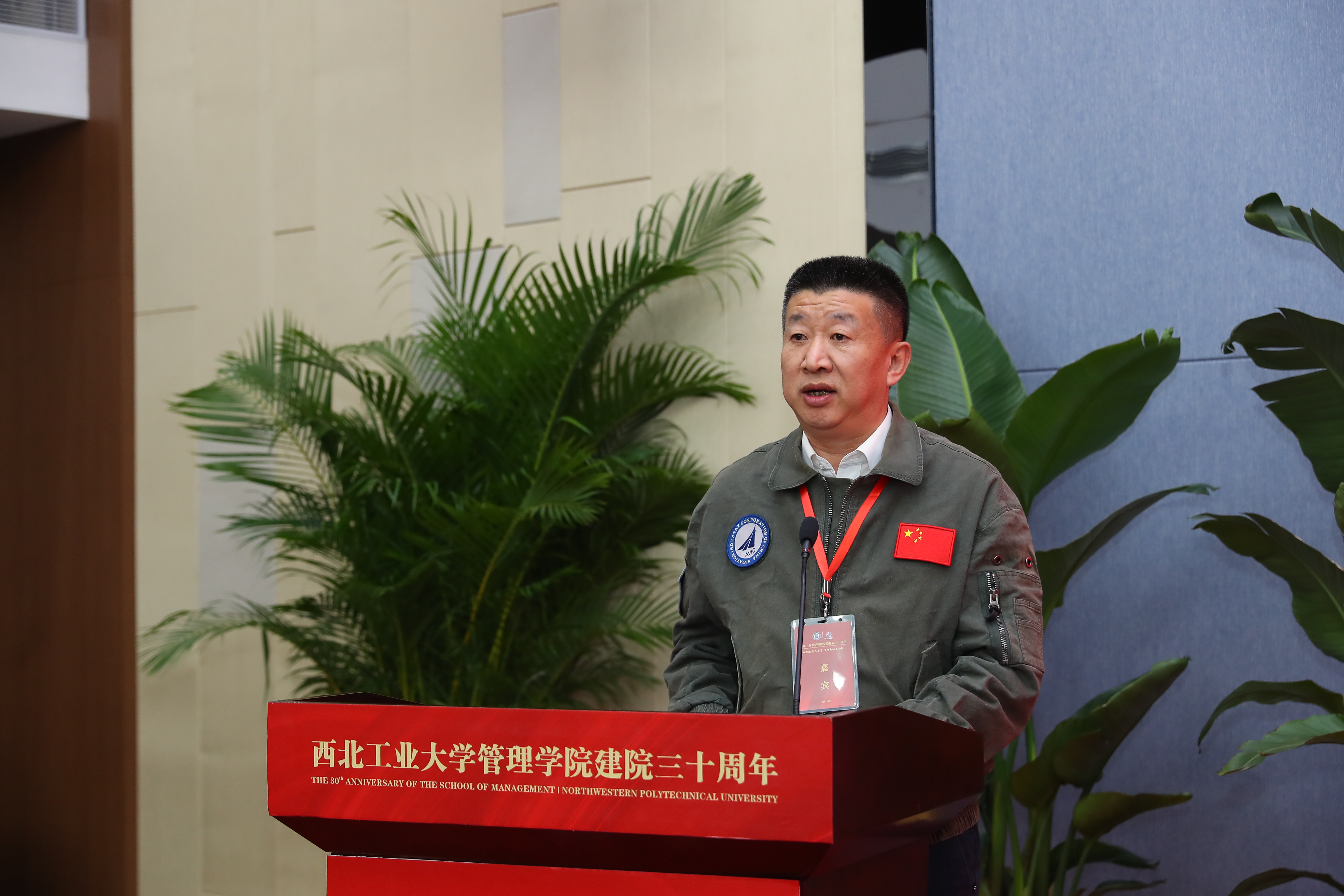 1990级校友、中国飞行试验研究院副总工程师、特级试飞员尹建峰代表广大校友发言,尹建峰深情回顾在管理学院求学的岁月里难忘的点点滴滴,青春无言,师恩难忘,并对在校学弟学妹们提出培养高尚品格、成就精彩未来、谱写奋斗青春之歌的期望。