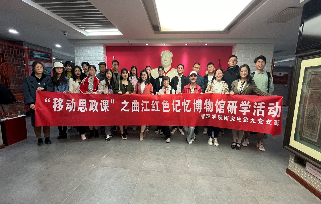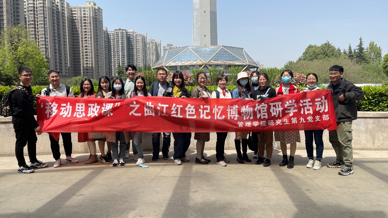 为贯彻习近平总书记关于崇尚英雄、缅怀英烈的重要论述和党史学习教育的重要讲话精神、深入学习英烈事迹、重温英雄历史、引导师生更好弘扬和传承红色精神文化,2021年4月17日上午十点,学校党委副书记、纪委书记张海兰老师,管理学院研究生辅导员吴蓓老师带领管理学院研究生第九党支部全体学生党员到西安市曲江红色记忆博物馆开展主题党日活动。