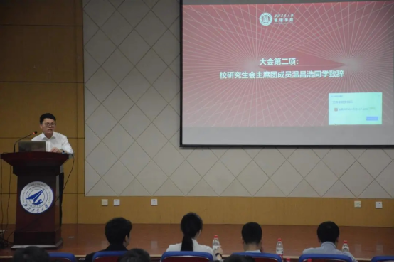 校研究生会主席团成员温昌浩同学首先致辞。温昌浩同学提到,在学院党委的坚强领导下、在学院团委的悉心指导下,管理学院研究生会始终坚持以习近平新时代中国特色社会主义思想为指引、紧密围绕全校中心工作、加强政治引领、创新工作方法、服务同学成长成才,团结带领广大同学为中国特色世界一流大学的建设做出积极贡献。