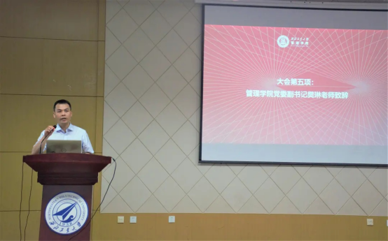 随后,管理学院第二届学生会主席团成员陈海峰同学进行了学生会工作报告。陈海峰对第一届学生会组建以来的工作做了汇报——不忘跟党初心,思想引领持续加强;全心全意服务同学,职能地位充分落实,权益工作持续推进。陈海峰也做了未来一年的工作展望——加强政治引领,团结同学投身强国伟业;抓好网络平台建设;发挥榜样引领作用;严格要求,持续推进改革;健全权益反馈沟通机制,发挥学生会在组织育人、实践育人、文化育人的显著优势,为实现中华民族伟大复兴中国梦贡献青春力量。