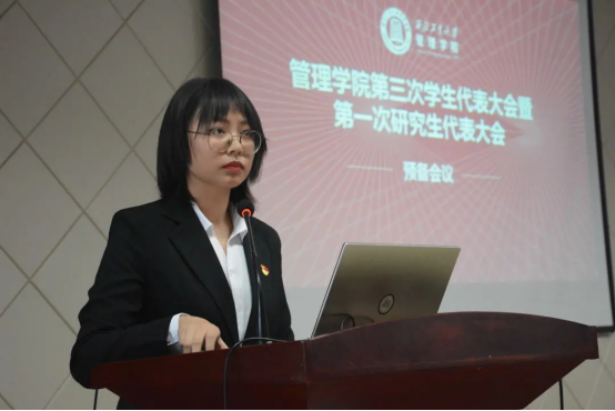 下午15时40分,预备会议正式开始。预备会议共有四项议程,筹备工作组代表梅文浩首先上台进行大会筹备工作的报告,其后,工作人员邢晓宇宣读西北工业大学管理学院第三次学生代表大会暨第一次研究生代表大会代表资格审查报告(草案),议程(草案)和主席团、秘书长名单(草案),代表均鼓掌通过。