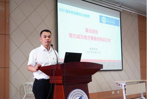 樊琳以“廉洁诚信,努力成为德才兼备的栋梁之才”为主题,用生动形象的案例引出话题,以我校陈士橹院士清廉勤勉做学术等事例,勉励毕业生在今后的道路上要廉洁从业、诚实守信、无愧于心。樊琳老师指出,值此共产党成立一百周年之际,管理学院2021届毕业生要从南山脚下出发,走向各自新的征程,在未来的工作学习中要坚持八小时以外和八小时以内一个样,要用严格的道德标准要求自己,要为我国社会主义事业不断奋斗。