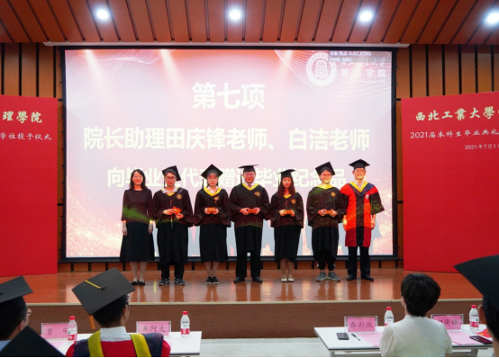 田庆锋、白洁代表学院向毕业生代表赠送一枚刻有姓名的印章作为毕业礼物。以印代信,希望全体毕业生可以坚定理想信念,担负时代重托!