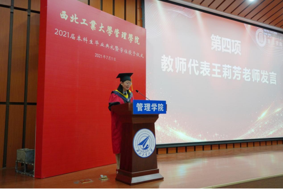 教师代表王莉芳教授为毕业生送上祝福与嘱托。她希望全体毕业生以梦为马,不负韶华,勇敢担当起国家、社会和家庭的责任。