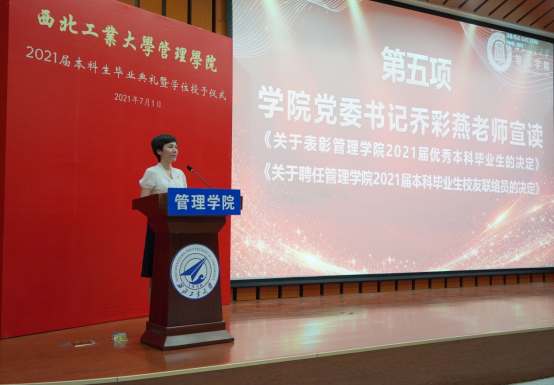 乔彩燕宣读《关于表彰管理学院2021届优秀本科毕业生的决定》及《关于聘任管理学院2021届本科毕业生校友联络员的决定》并向校友联络员代表颁发聘任证书。她希望优秀毕业生能继续发扬优秀传统,弘扬母校“三实一新”的校风,践行“公诚勇毅”的校训精神,以实际行动积极投身祖国建设,到祖国和人民最需要的地方去绽放青春。此外,她指出,校友与学院根脉相连,是学院割舍不断的情怀,希望各位校友联络员不管走到哪里,都能不忘联络员的职责使命,继续关心母校与学院的建设和发展。