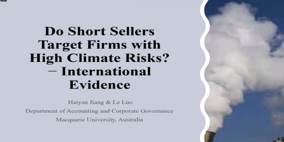 2021年7月23日上午10:00,新西兰麦考瑞大学Haiyan Jiang副教授通过ZOOM平台做了题为“Do short sellers target firms with high climates risks?-international evidence”的讲座。本次讲座由苏坤教授主持,管理学院教师和研究生参加了此次讲座。