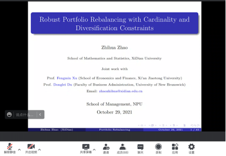 2021年10月29日下午13:00,西安电子科技大学数学与统计学院赵志华老师通过线下和线上相结合的形式做了题为“Robust Portfolio Rebalancing with Cardinality and Diversification Constraints”的讲座。本次讲座由赵龙峰副教授主持,管理学院教师和研究生参加了此次讲座。