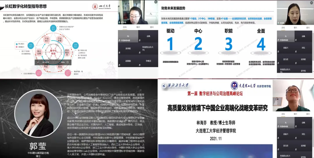 14日上午的平行论坛结束后,由西北工业大学管理学院会计系主任金帆主持,在线参访了国内知名的数据治理和数据分析服务提供商美林数据技术股份公司,通过参观“预见制造”展厅,了解数据科学在制造领域的具体应用,使论坛参与者与数字经济进行了一场“亲密接触”。14日下午的平行论坛后,金帆主持了由学术期刊《南开管理评论》《西北工业大学学报(社会科学版)》《财务管理研究》《重庆理工大学学报(社会科学)》主编、编辑参与的圆桌论坛,各期刊主编、编辑介绍了刊物的特点,分享了对数字经济领域学术研究的期待,并对青年学子担当重任寄予了厚望。
