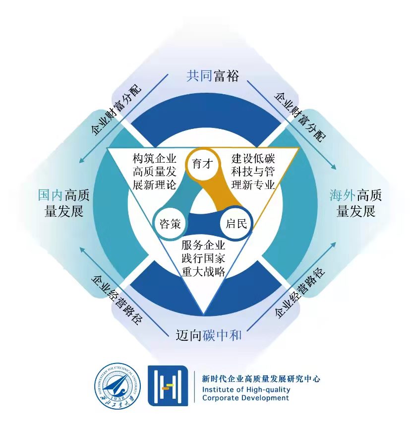 该项目由西北工业大学新时代企业高质量发展研究中心团队申报成功。该中心于2021年6月正式成立,是学院大力发展哲学社会科学,开展有组织科研,打造的哲学社会科学研究高地。中心主任为贾明教授,副主任为杨倩长聘副教授,成员包括邵婧、张莹、黄珍和刘慧四位青年教师。中心以服务国家重大战略为驱动,形成“3-3-3”的发展理念,即立足三大能力(育才、咨策、启民),围绕三大领域(共同富裕、“30-60”双碳、“一带一路”高质量发展),完成三大工程(构筑企业高质量发展新理论、建设低碳科技与管理新专业、服务企业践行国家重大战略)。