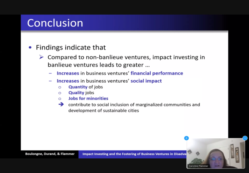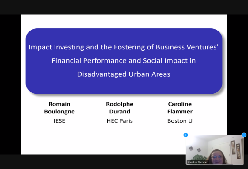应管理学院邀请,哥伦比亚大学国际与公共事务学院Caroline Flammer教授近期为管理学院师生作了题为“Impact Investing and the Fostering of Business Ventures' Financial Performance and Social Impact in Disadvantaged Urban Areas”(在城市弱势地区进行影响力投资,培养商业企业的财务绩效和社会影响力)的线上讲座。管理学院贾明副院长和近百名本校师生,以及来自中国人民大学、南京大学、上海科技大学等多所国内知名高校的师生参加了此次讲座。讲座由张莹副教授主持。