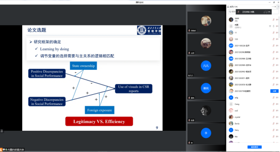 沙龙在辅导员袁媛老师主持下开展,邀请了国家奖学金获得者,2018级博士向翼同学做汇报。向翼以“实证研究中的一点体会”为题,以发表在《Journal of Management》上的文章为例,围绕论文选题、论文撰写、论文投稿以及论文修改这四个方面,详细分享了自身在科研过程中面临的问题和体会。