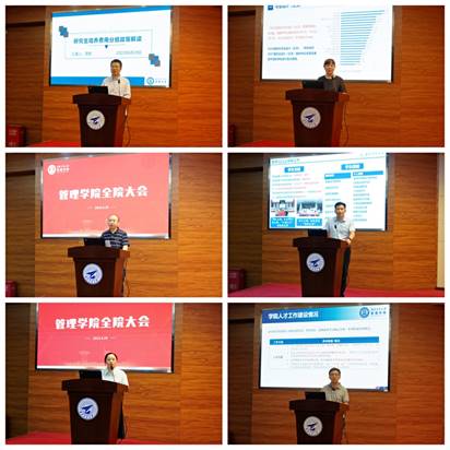 院长助理邵婧通报了今年以来学院国际化认证工作与暑期学堂工作的开展情况。院长助理李乘龙传达了学校人才工作会议精神,并报告了学院现阶段相关工作情况。