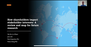 下半场报告由张莹副教授主持。由迈阿密大学迈阿密赫伯特商学院(University of Miami,Miami Herbert Business School)的Prof. Wei Shi回顾了股东如何影响利益相关者利益方面的研究,并进一步提出可以探索的研究方向。