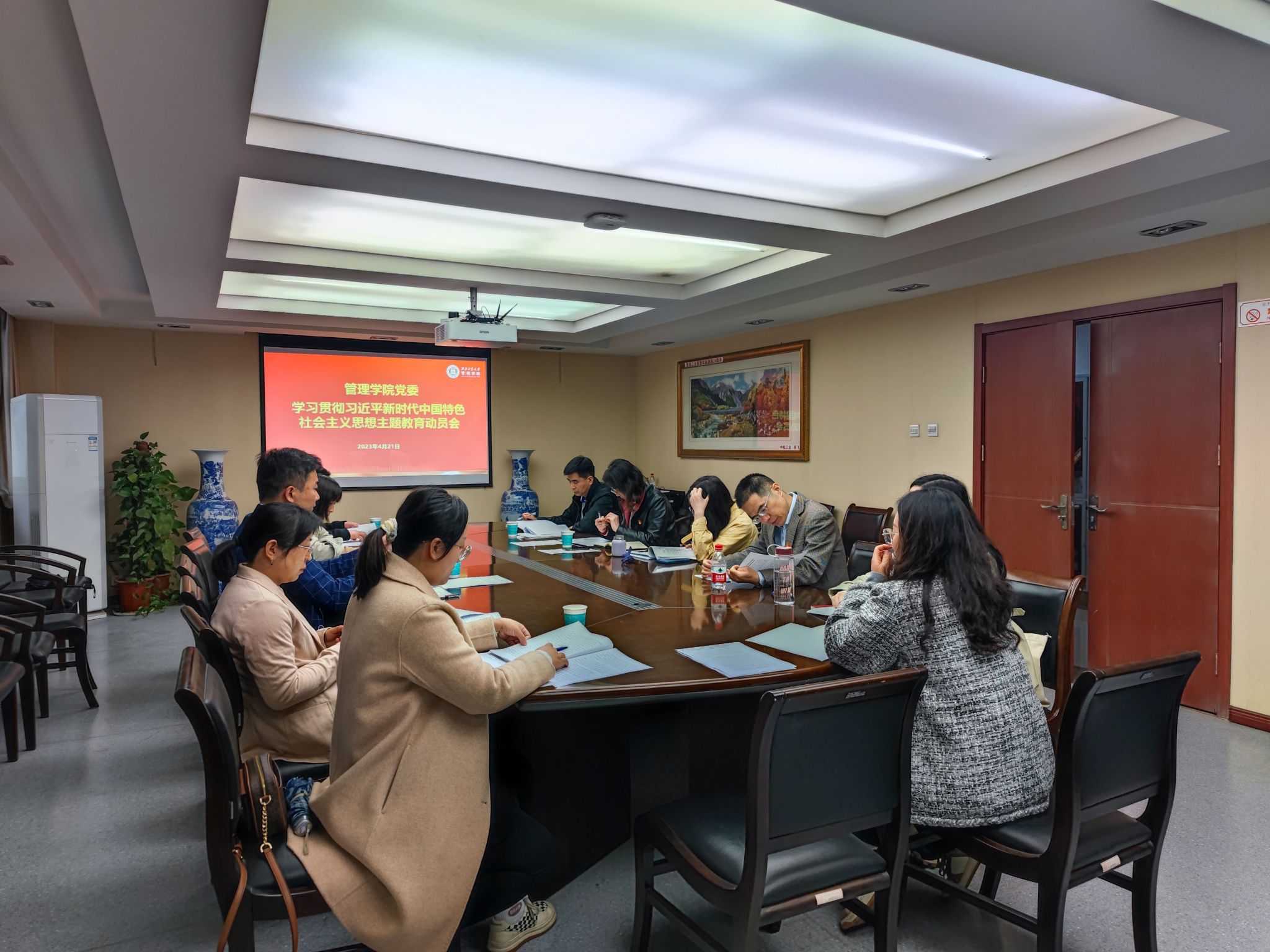 4月21日下午,管理学院召开党委理论学习中心组(扩大)会议,传达学校学习贯彻习近平新时代中国特色社会主义思想主题教育动员会会议精神,并就学院落实主题教育实施方案进行研讨。学院党委副书记王兆旭主持会议,领导班子、中心组成员参加会议,各教工党支部书记、系主任列席会议。