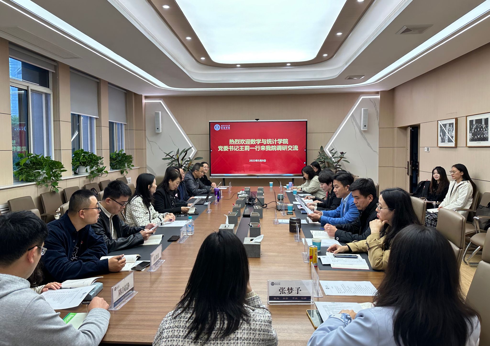 为深入学习贯彻习近平新时代中国特色社会主义思想,扎实开展调查研究,加强与兄弟学院之间的沟通交流,推动校、院高质量发展。5月9日下午,数学与统计学院党委书记王莉一行到管理学院调研交流,开展主题教育联学共建活动。两院师生党支部书记代表、党建学工队伍召开座谈会,共话党建工作,共谋学院发展。