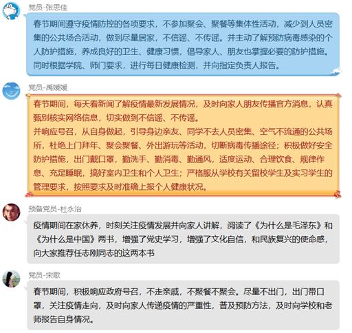 2月4日共同学习了《教育部致全国大学生的一封信》后,举行了线上交流分享的主题党日活动,各位党员交流了疫情期间自己的学习、锻炼、媒体声援等等所有相关的行为。虽然疫情阻碍我们各项外出活动,但各位党员同志保持乐观积极的心态,不断充实自我,并积极向周围亲属传递正能量,正确控制防范疫情,调整心态。