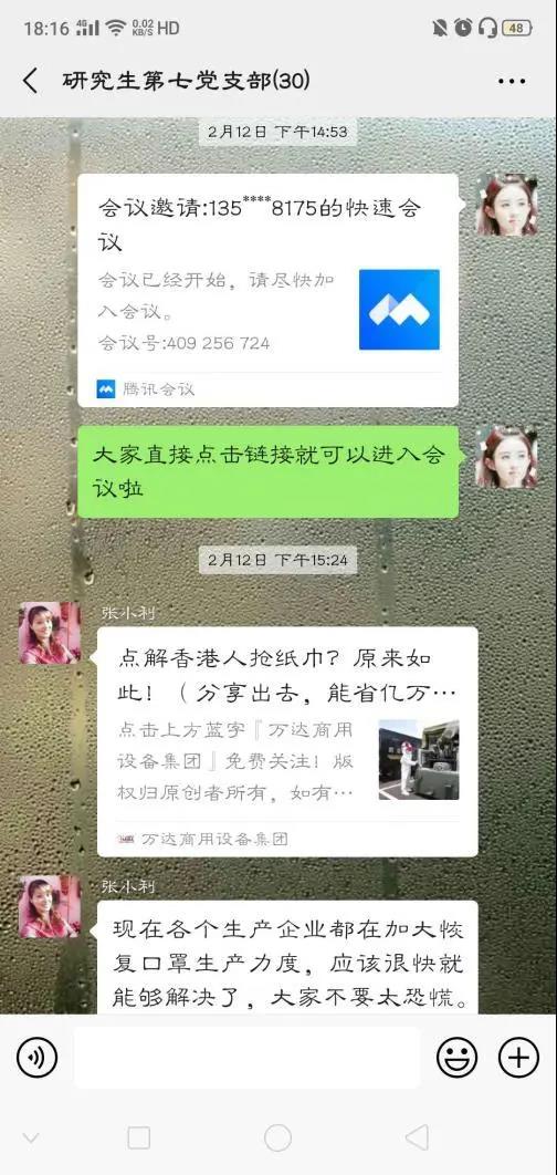 支委会讨论的最终结果:按预期讨论结果,我支部于2月14日下午三点准时开展线上党员大会,本支部23名党员同志积极参加本次线上会议,本次会议主要形式为疫情状况分享(即分享自己身边防控疫情的所见所闻或者亲身经历等),通过这次交流我们了解到有很多地方的疫情状况很严重,甚至全家人都没有口罩无法出门买菜,有些地方疫情没过又有了禽流感,真的是一波未平,一波又起……
