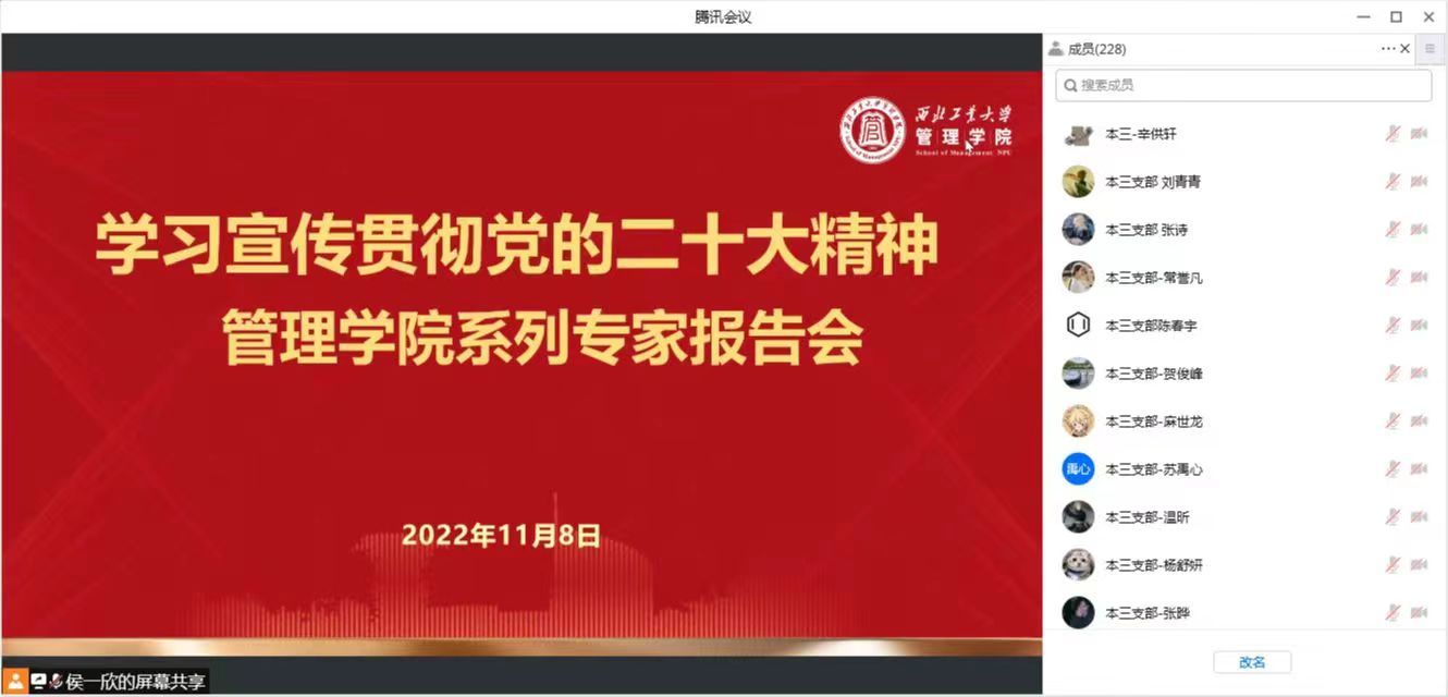 11月8日,管理学院举行“学习宣传贯彻党的二十大精神”专家辅导报告第一期,邀请中共陕西省委党校侯建会教授作宣讲报告。学院全体师生党员参加了线上学习,报告由学院党委书记乔彩燕主持。