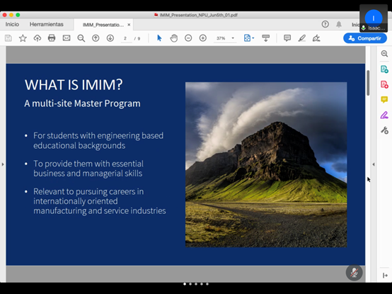 会议邀请了西班牙马德里理工大学工业工程师学院Isaac Lemus教授和西北工业大学国际教育学院留学生招生办公室李梦晨老师,分别讲解了IMIM项目和国际生来访西北工业大学的申请手续及生活情况。