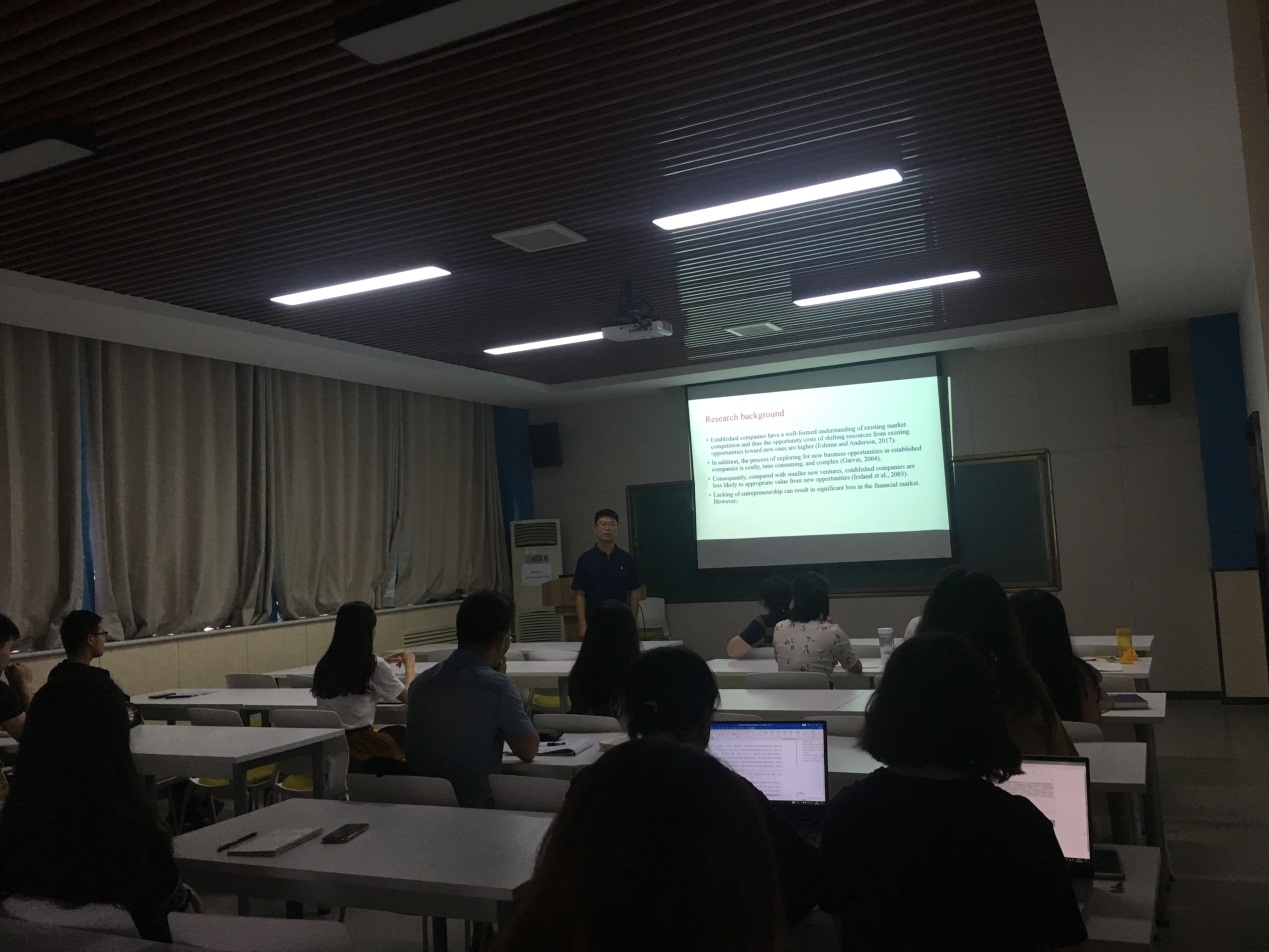 7月4日,美国西弗吉利亚大学王新春助理教授在我院举办了题为“Nothing Ventured? Analyst Reaction to Entrepreneurial Orientation in Established Companies”的报告。报告会由管理学院常玉教授主持,来自管理学院的本科生和硕士生参加了此次报告会。