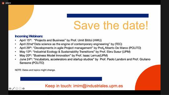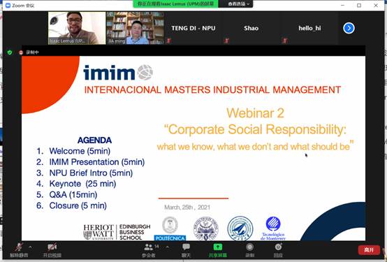 2021年3月25日晚,管理学院协同西班牙马德里理工大学共同举办欧盟伊拉斯谟IMIM工业管理国际硕士联合培养项目系列宣讲会。这是IMIM工业管理国际硕士联合培养项目系列宣讲会的第二讲,第一讲已于3月18日晚进行。本次宣讲会由来自西班牙马德里理工大学的Isaac Lemus-Aguilar教授主持。
