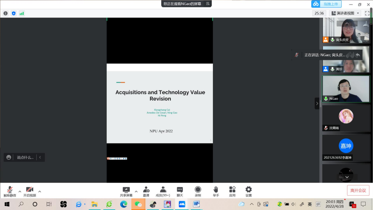 2022年4月28日晚上8点,应管理学院邀请,曼彻斯特大学高宁副教授在腾讯会议上作了题为“Acquisitions and Technology Value Revision(公司并购和科技价值评估)”的讲座报告。本次讲座由高伟伟老师主持,管理学院100余名师生参加了讲座。