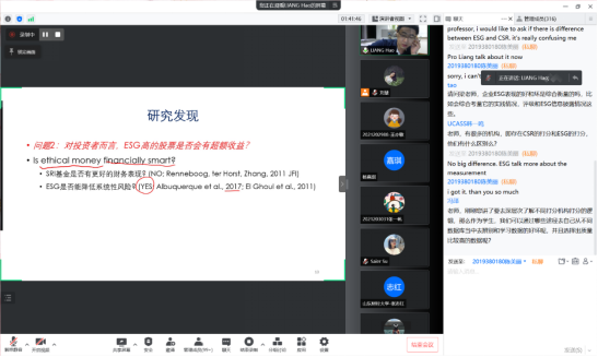讲座中,梁昊副教授全面系统地回顾了ESG领域的研究前沿,并结合自己的研究介绍了ESG的热门研究方向、重点研究话题;同时深入讲解了ESG评分的主要数据库以及做相关研究时数据库的选择。随后,梁昊副教授结合自己作为国际顶级学术期刊的主编、副主编以及编委等的审稿经验,为大家详细深入讲解了国际顶级学术期刊的投稿技巧、审稿流程等十分实用的信息,参与讲座的师生收获颇丰。在讲座的互动环节,会议评论区的留言不断,互动活跃,梁昊副教授针对大家的提问做了详细的回答。