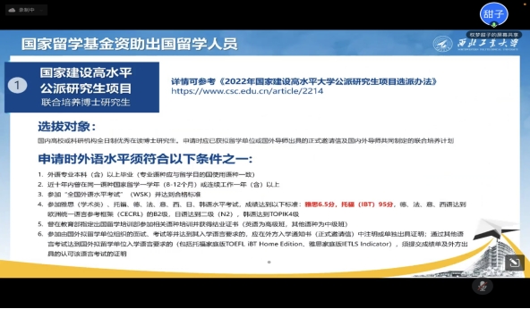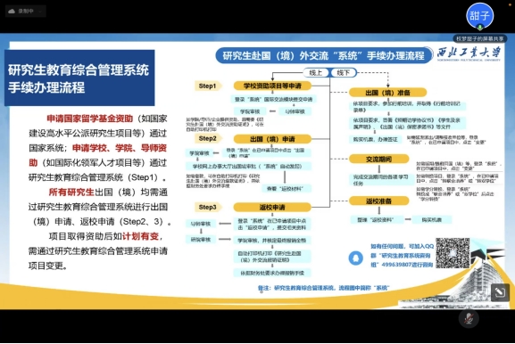 会上,权梦甜子从国家留学基金委资助项目、学校资助项目及学院合作项目三个方面为同学们进行了详细解读,重点介绍了各个项目的申请时间、申请条件及相关资助政策。同时,以研究生教育综合管理系统申请为例,从项目申请、出国(境)申请、返校申请等方面分别介绍了学生出国(境)交流需要办理的相关流程及手续,强调要严格遵守学校的规章制度。