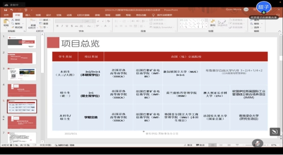 2022年9月21日晚,管理学院开展学生赴国(境)外交流项目线上宣讲会。本次宣讲会由学院外事秘书权梦甜子主讲,详细介绍了学校及学院赴国(境)外交流项目的相关政策及流程办理,学院多名本科生及研究生参加。
