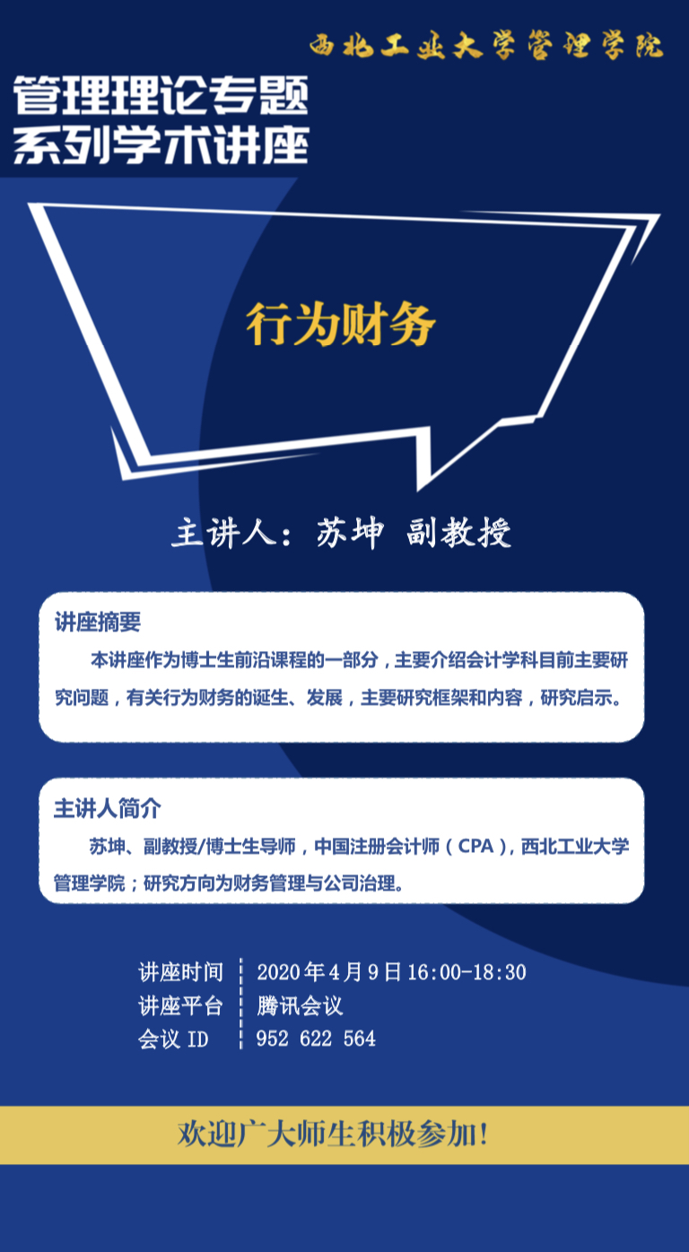 讲座摘要:本讲座作为博士生前沿课程的一部分,主要介绍会计学科目前主要研究问题,有关行为财务的诞生、发展,主要研究框架和内容,研究启示。