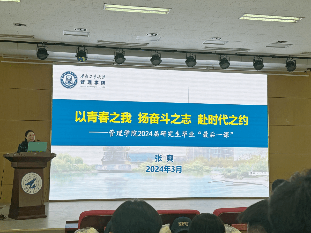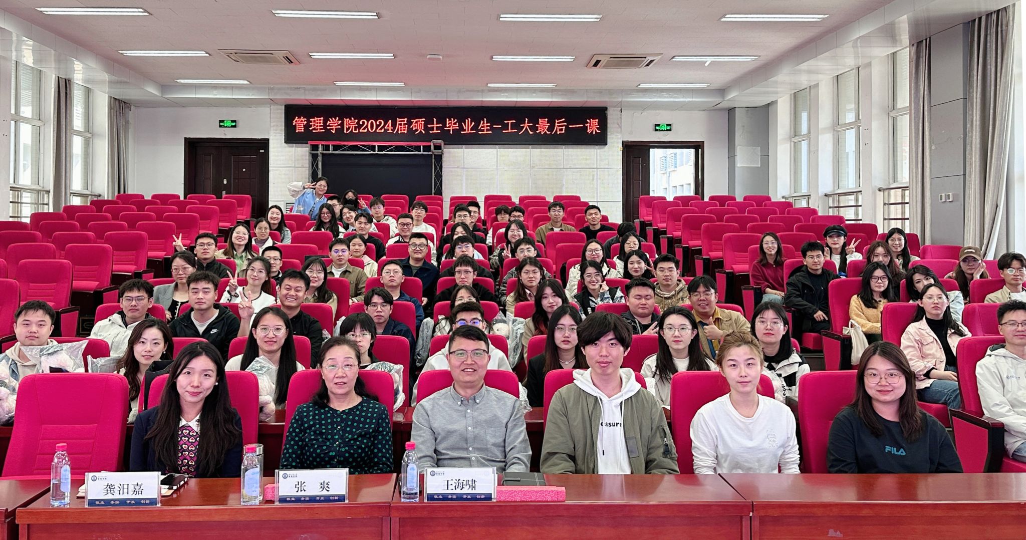 为切实做好2024届毕业生离校教育工作,3月28日下午,管理学院党委书记张爽以《以青春之我 扬奋斗之志 赴时代之约》为题,为2024届全体硕士研究生讲授了“工大最后一课”。本次授课由学院党委副书记王海啸主持。